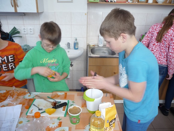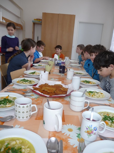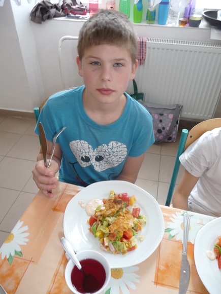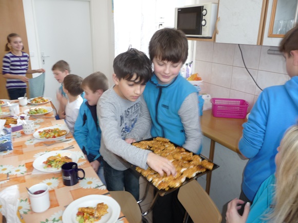 Ve škole jsme se pustili do vaření následujících pokrmů – zeleninová polévka s domácí zavářkou, zeleninový salát s dresinkem, kuřecí řízečky v cornflakes s krémovým dresinkem, cereální Australské hrudky. Moc nám chutnalo. Při hodování jsme samozřejmě dbali na správné stolování. Po úklidu kuchyňky jsme se s plnými bříšky a dobrou náladou odebrali ke svým domovům.