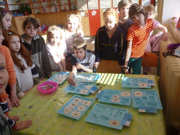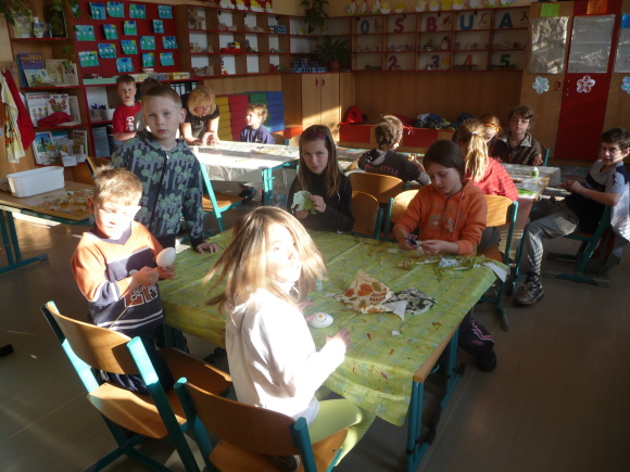 Hned ráno děti začaly zdobit vejdunky ubrouskovou technikou. Šikovné prstíčky přilepily vystřižené velikonoční motivy podle jejich vlastní představy. Potom si vybraly z umělohmotné formy určitý tvar s velikonočním námětem a do něho lily rozředěnou sádru. Po mírném ztuhnutí si do něj vmáčkly magnet. Výrobek jim byl předán při odchodu domů již ztvrdlý. Doma si jej měly ještě vybarvit.