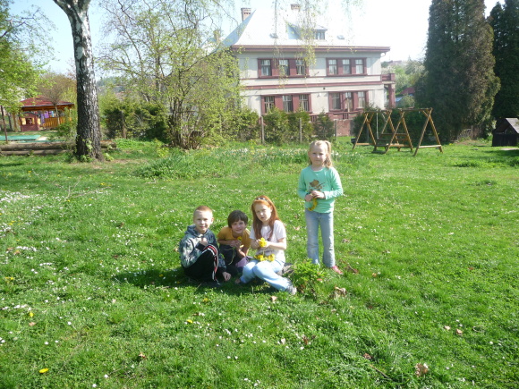 Po svačince děti řádily na zahradě, bylo nádherné počasí, a tak holčičky seděly na dekách a pletly věnečky. Kluci mezitím sportovali.