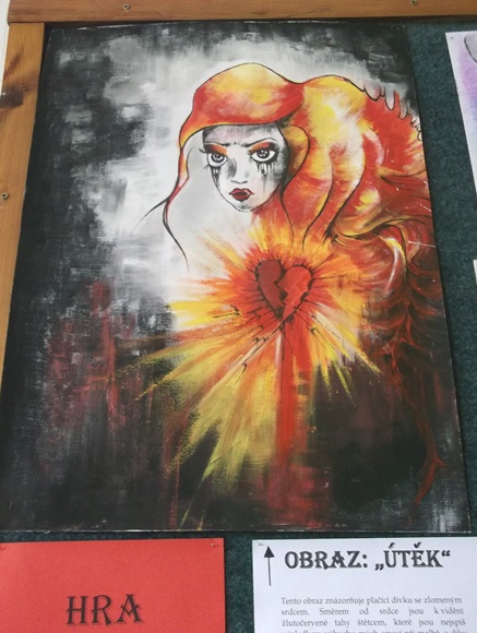 Vraťme se k vernisáži výstavy. Autorka výstavu rozdělila do tří částí: První část nesla název „VZPOMÍNKY Z DĚTSTVÍ“. Tato část byla věnována obrázkům namalovaným v období dětství a dospívání: „Každý člověk stejně jako já nějak začínal. V dětství jsem se chodila rodičům chlubit s podivnými čmáranicemi na papíře, ze kterých nikdo nedokázal rozluštit, co vůbec znamenají. Pro mě to ale byla dokonalá díla, na která jsem byla pyšná. Dnes už se pouze začervenám hanbou, když vidím ty „kresby“. Ale i to má svoje výhody, díky těm obrázkům z dětství totiž vidím pokroky a to, jak jsem se stále zlepšovala.“ (z kapitoly „Moje začátky“) Ve druhé části výstavy s názvem „HRA S BARVAMI“ Káťa představila obrazy různých formátů a technik. „S první částí mé výstavy mají něco společného, a tím je maximální svoboda, malovala jsem totiž vždy tím, čím jsem doopravdy chtěla, nikdo mi neradil, a volně jsem zobrazovala, cokoliv mě napadlo a především jsem používala svůj nejoblíbenější styl – kombinovanou techniku.“ (z kapitoly „Výstava“) Právě v této části výstavy byl umístěn obraz s názvem „ÚTĚK“, který Káťa namalovala jako součást své absolventské práce. „Tento obraz znázorňuje plačící dívku se zlomeným srdcem. Směrem od srdce jsou k vidění žlutočervené tahy štětcem, které jsou nejspíš výsledkem výbuchu mých emocí při malbě, a díky tomu z obrazu vyzařuje dynamičnost, kterou ale pohlcuje tmavé pozadí za dívkou…“ (z kapitoly „Emoce v mých obrazech“) Ve třetí části výstavy s názvem „I UMĚLEC SE STÁLE UČÍ“ Káťa ukázala své studie: zátiší, drapérie, stínování a perspektivy. „Tato část výstavy je založena na dodržování pravidel, především v perspektivě, kterou jsme se učili na výtvarném kroužku každou hodinu, možná se vám zdá, že to až moc prožívám, ale když půl roku děláte jen s obyčejnou tužkou a gumou, tak to není příjemné a ještě když vám to nejde a nebaví vás to…, ale díky tomu můžu potvrdit, že každá věc je opravdu k něčemu dobrá, protože ty černobílé kresby mi pomohly naučit se perspektivu, která se mi osvědčila v úspěšně ukončených talentových zkouškách na střední školu.“ (z kapitoly „Výstava“)