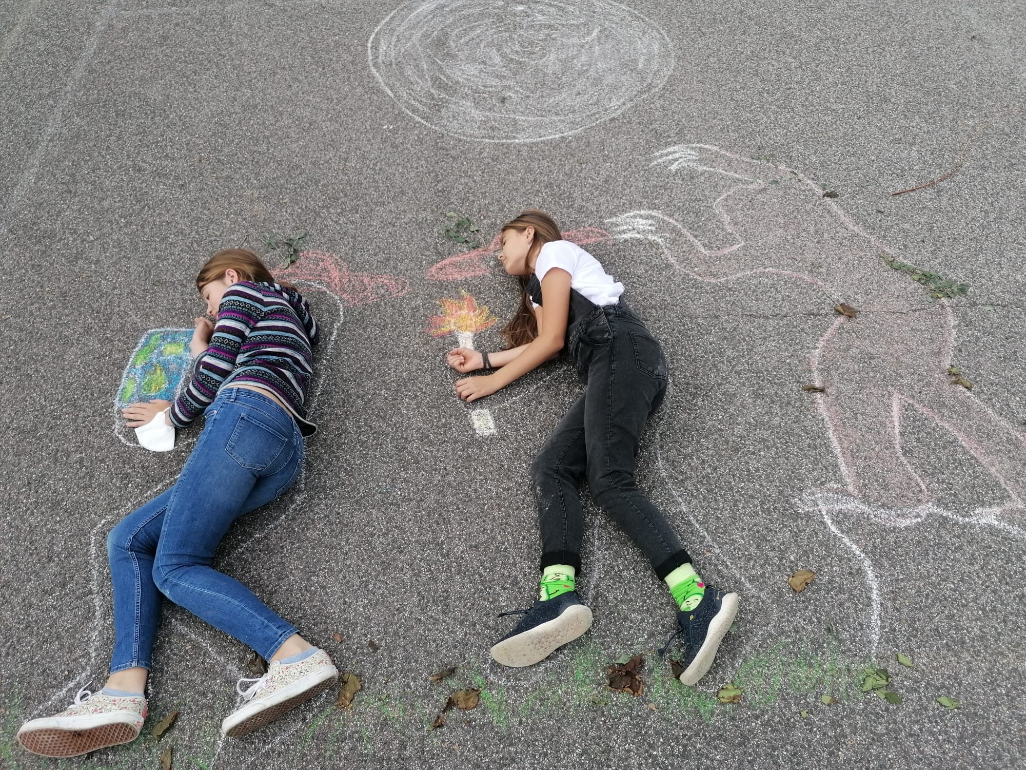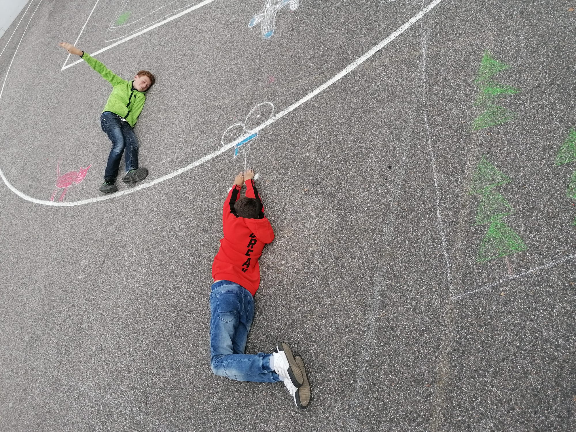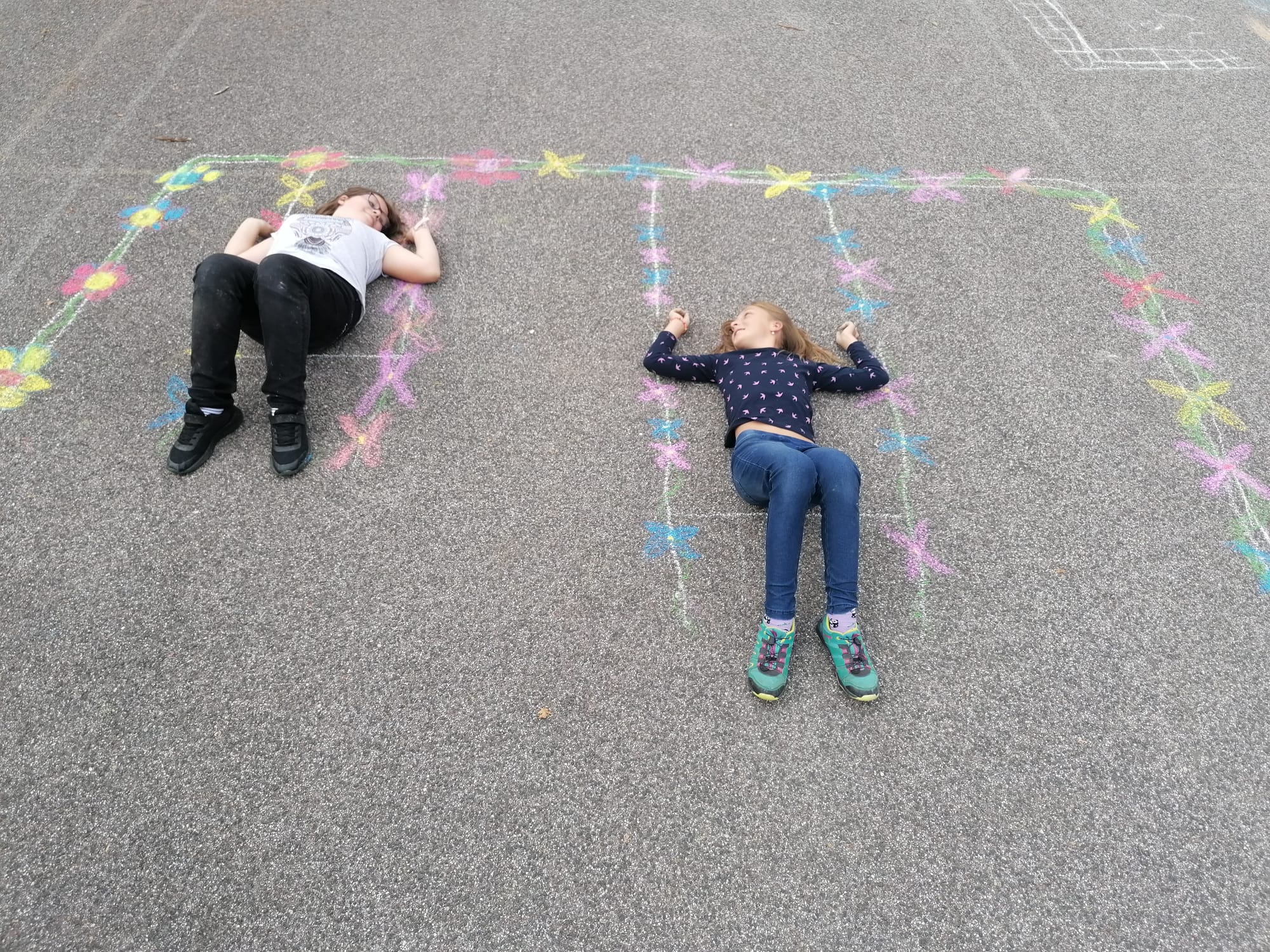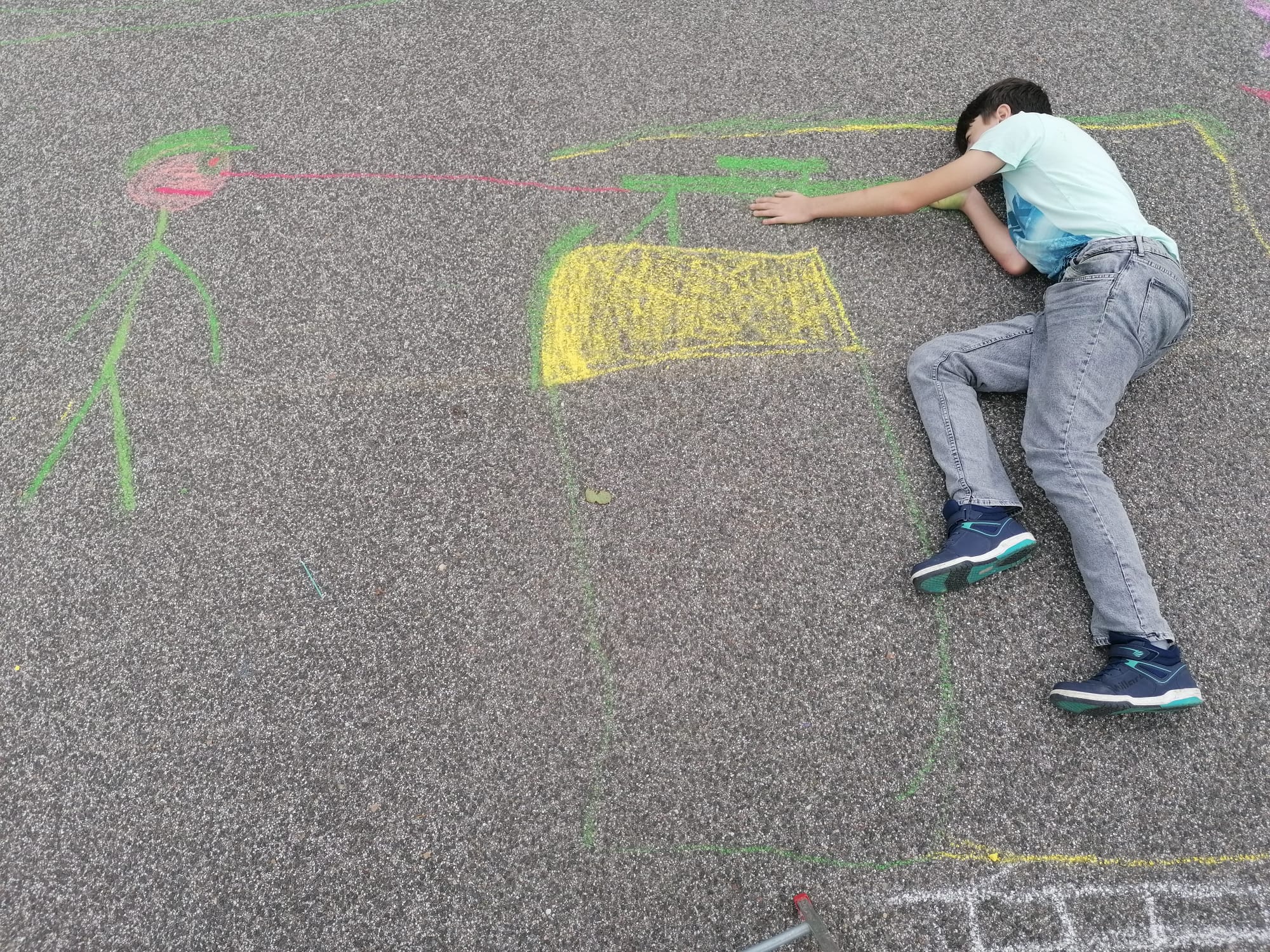 I v posledních dnech využíváme pěkného počasí a chodíme ven. Šesťáci se na hodině výtvarné výchovy trošku povalovali po zemi. Přesto však jejich výtvory stojí za zhlédnutí.
