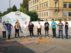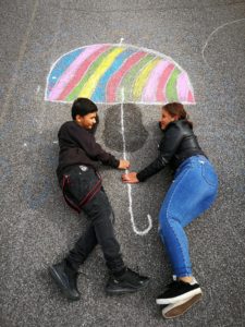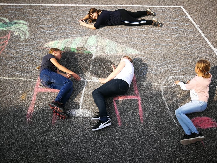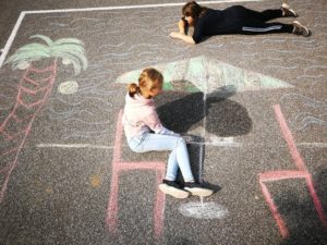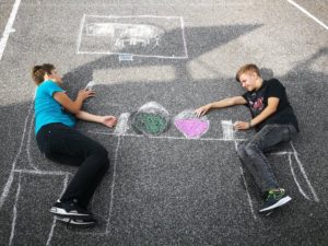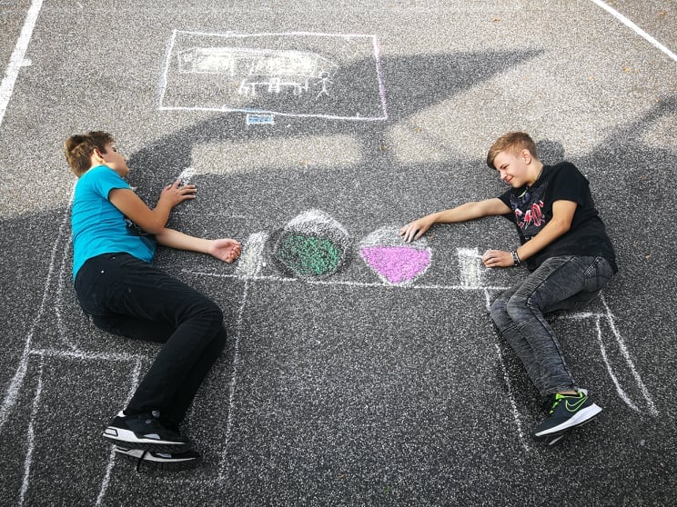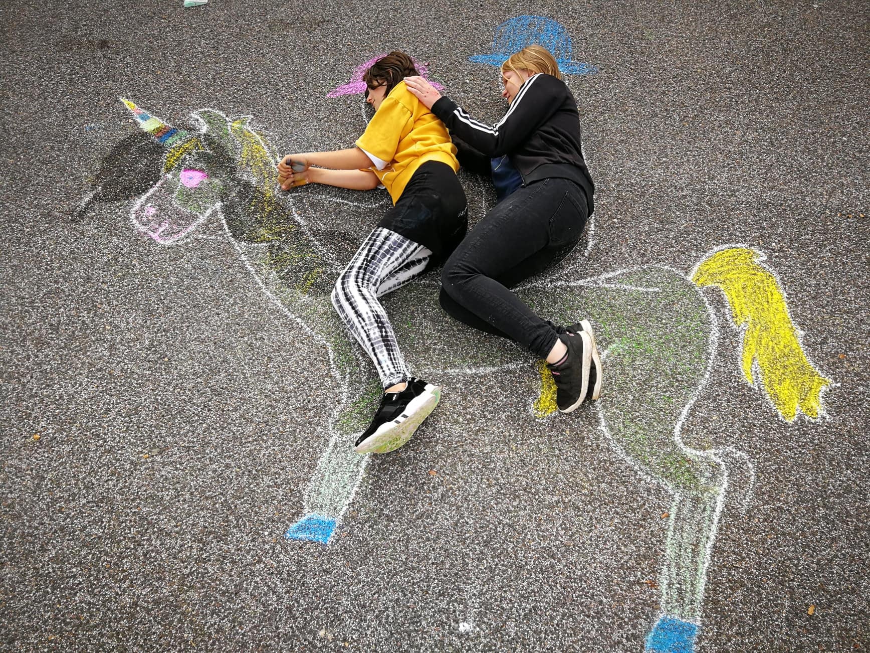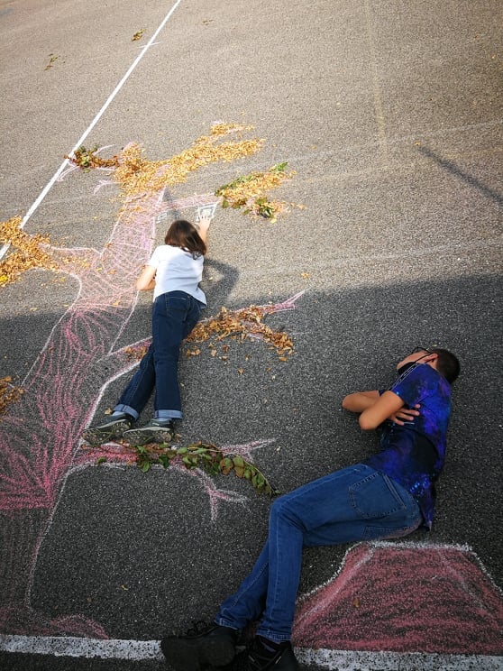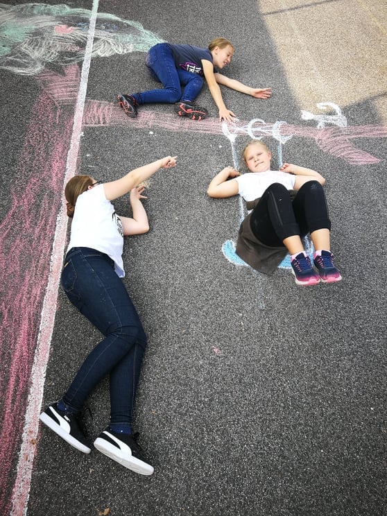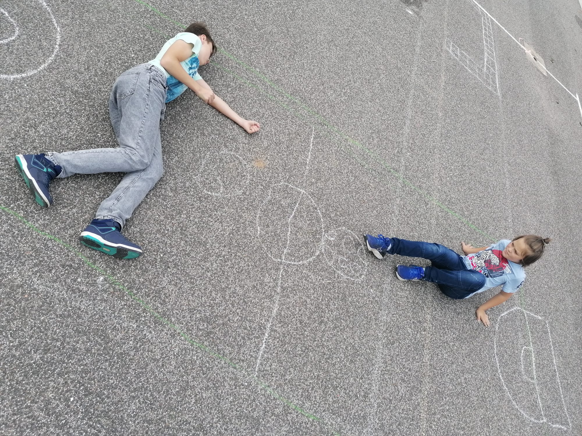 I v posledních dnech využíváme pěkného počasí a chodíme ven. Šesťáci se na hodině výtvarné výchovy trošku povalovali po zemi. Přesto však jejich výtvory stojí za zhlédnutí.