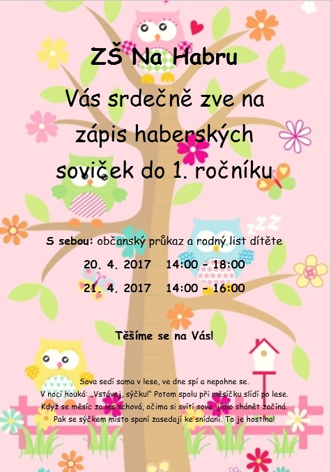 Zápis dětí do 1. ročníku pro školní rok 2017/2018 se bude konat v prostorách školy