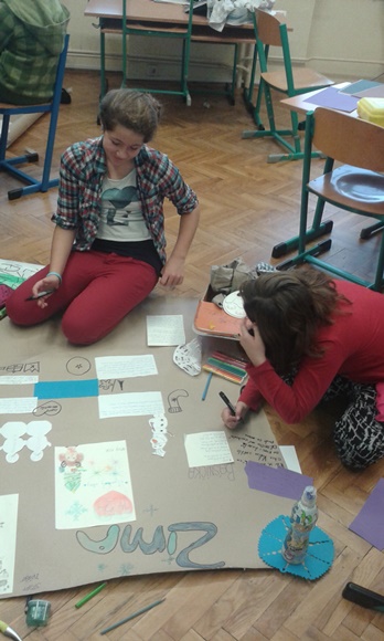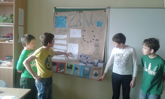 Po prvním dni, kdy jsme zimu a chlad zakoušeli pěkně na vlastní kůži, jsme druhý den strávili raději v teplém a útulném prostředí školy. Hledali jsme odpovědi na zmíněné otázky, zkoušeli si, jak poznáme zvířecí stopy, za zvuku Vivaldiho skladby se zamýšleli nad tím, jak zima působí na nás samotné, a veškeré naše postřehy poté zpracovali do plakátu. Plakáty sice byly (stejně jako samotná zima) oproti těm podzimním chudší a méně barevné, zato při jejich prezentaci jsme udělali velký pokrok… 🙂